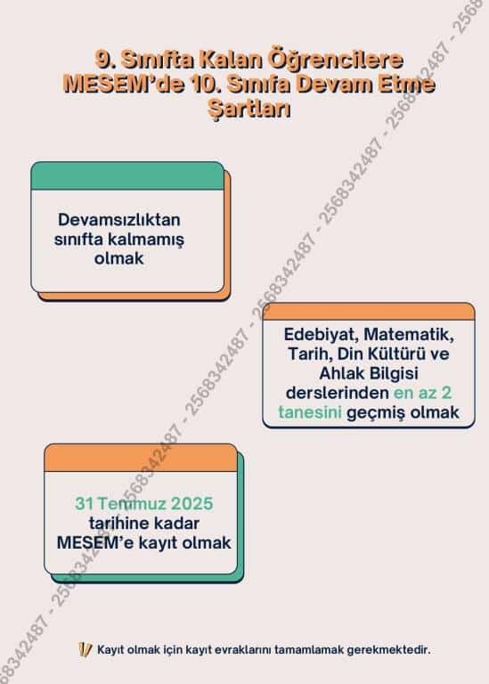 2024-2025 eğitim-öğretim yılında 9. sınıfta kalan öğrencilerimizin, MESEM (Mesleki Eğitim Merkezi) kapsamında 10. sınıfa devam edebilmeleri için gerekli şartlar açıklanmıştır: